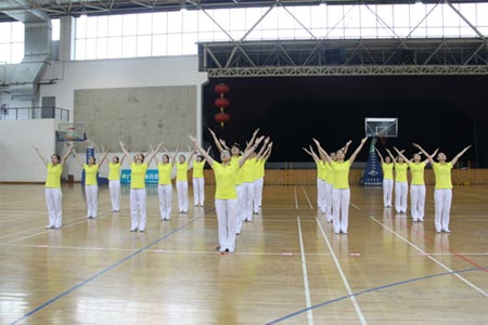 “一二一,一二一……” 广东外语艺术职业学院体育馆传出嘹亮的口号声,只见众多队伍踏着整齐的步伐,在认真地排练,准备参加广州市天河区卫生系统职工广播体操比赛。本次大赛共有31个队伍参加,参赛队伍分别来自于天河区的医院、公司、街道等地方,是一次阵容庞大的比赛。